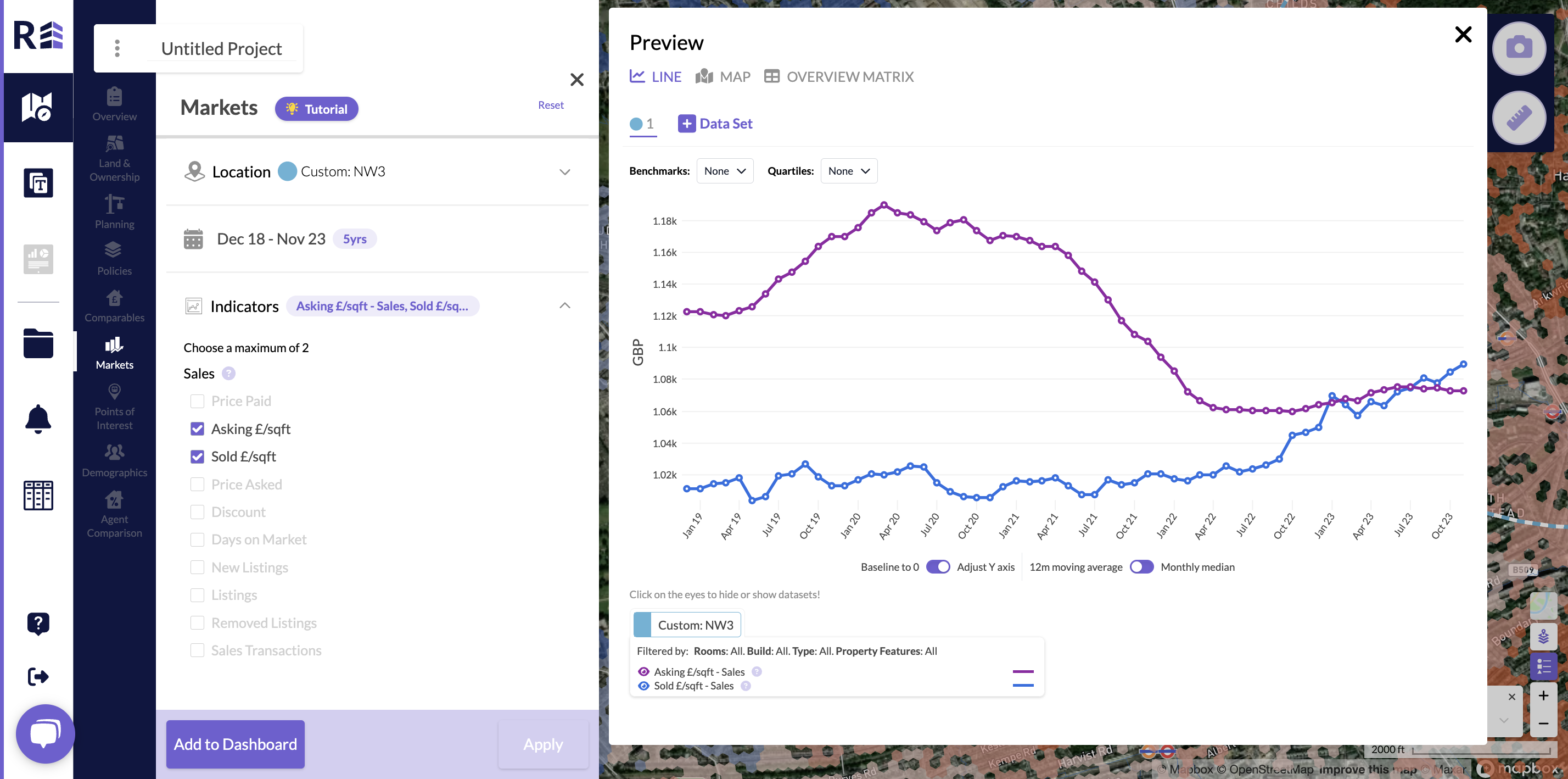 Start by selecting the time period you want to view data on, then select the two sales indicators you would like to view/measure and hit apply. A graph will become visible below the filters showing the trends on a monthly basis.